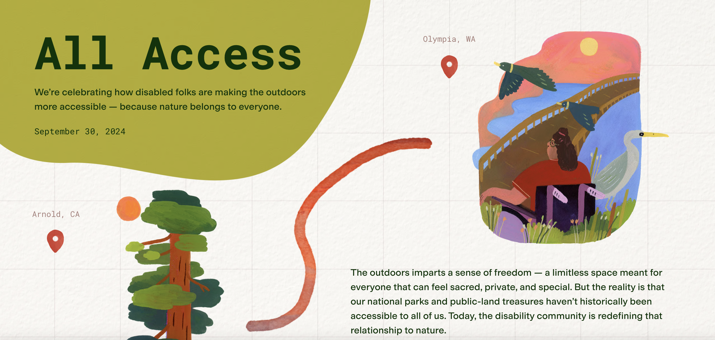 All Access is Popsugar’s first-ever accessibility issue that I concepted, edited, and launched alongside our special projects editor and shopping editor, as well as the late MacArthur genius grant recipient Alice Wong. The special issue centers and celebrates the people, places, and things making nature more accessible to everyone.